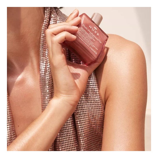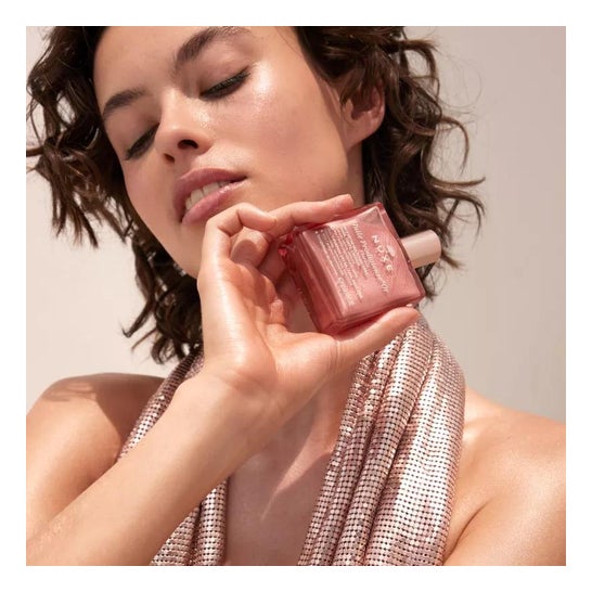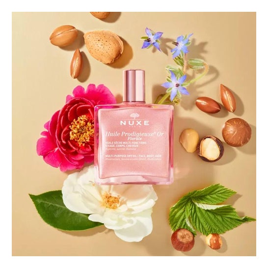 Nuxe Huile Prodigieuse Or Florale 50ml est une huile sèche pailletée aux nacres d'origine naturelle conçue pour hydrater, satiner et illuminer visage, corps et cheveux, en un seul geste.