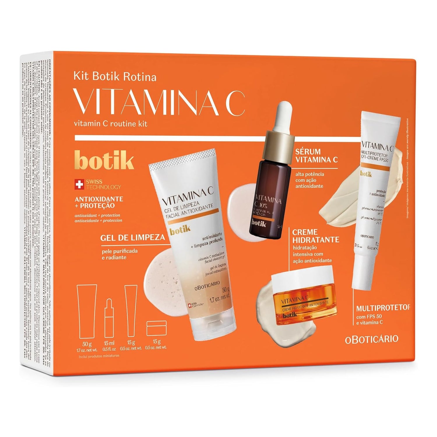 O Boticário Botik Vitamina C Routine Kit est un ensemble qui comprend quatre produits de la ligne Botik, conçus pour offrir un rituel de soin et de protection en version mini. Ce kit est adapté à tous les types de peau et est formulé pour créer un bouclier protecteur contre les agressions quotidiennes et le stress oxydatif, permettant d'obtenir une peau plus uniforme et lumineuse.