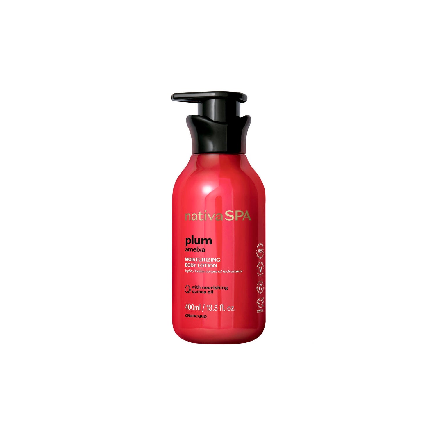 O Boticário Nativa SPA Prune Lotion Hydratante 400ml est l'option parfaite pour ceux qui recherchent une hydratation profonde et durable de la peau du corps. Cette lotion combine le pouvoir nutritif des gouttes purifiées de quinoa avec le parfum intense de la prune, apportant vitalité et douceur à la peau dès la première application.