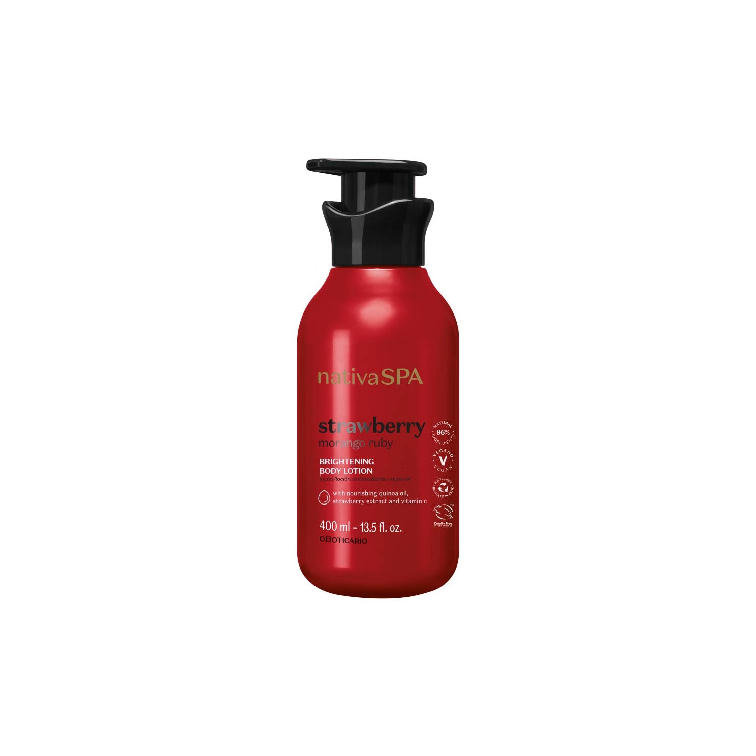 O Boticário Nativa SPA Morango Ruby Lotion Hydratante 400ml est idéal pour ceux qui recherchent une hydratation intense et durable pour la peau du corps. Cette lotion est formulée pour redonner luminosité et vitalité à tous les types de peau, aidant à prévenir le vieillissement prématuré et offrant un arôme fruité sophistiqué.