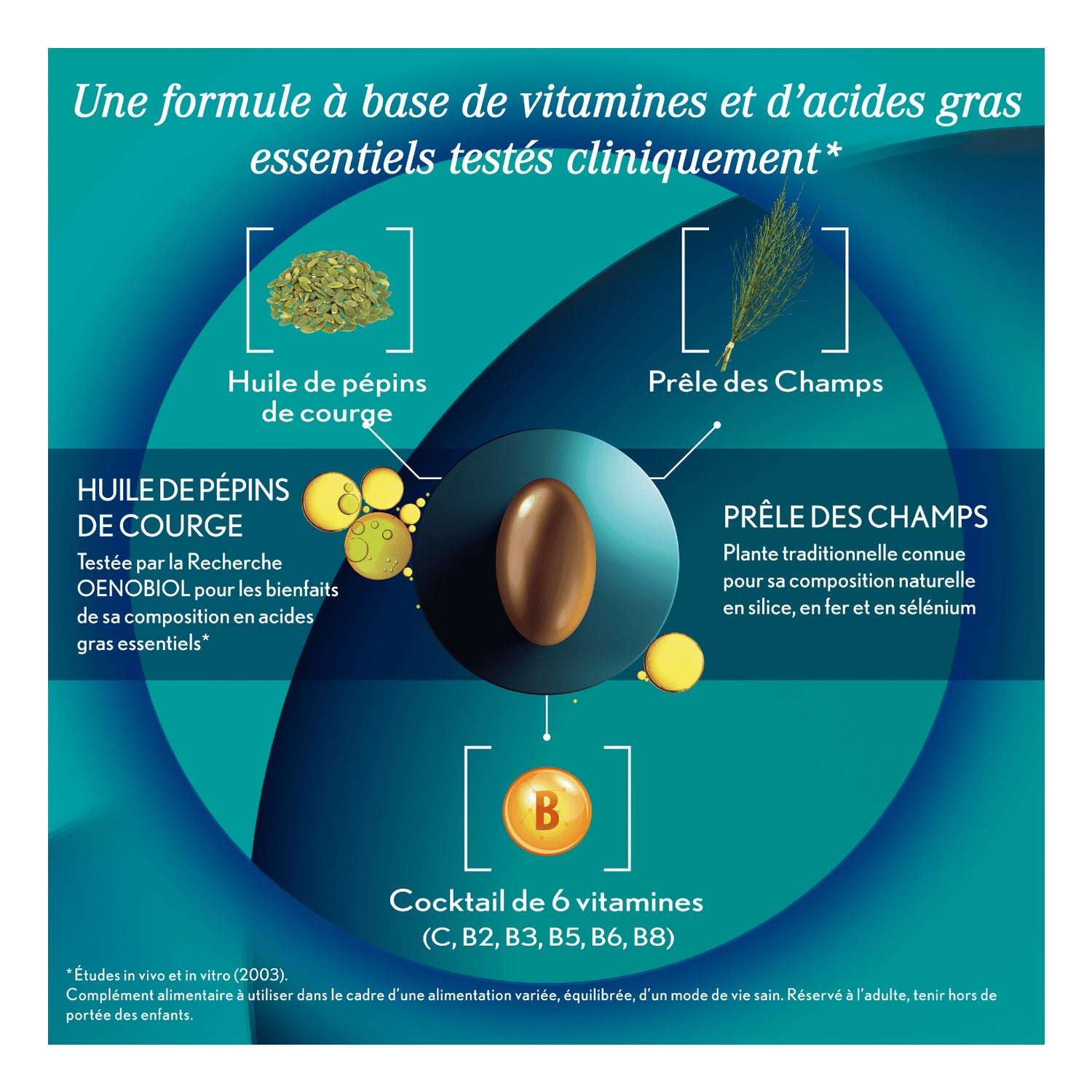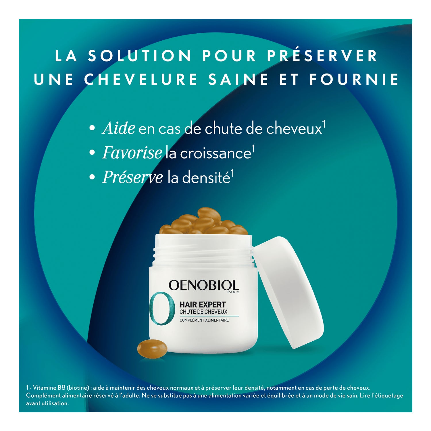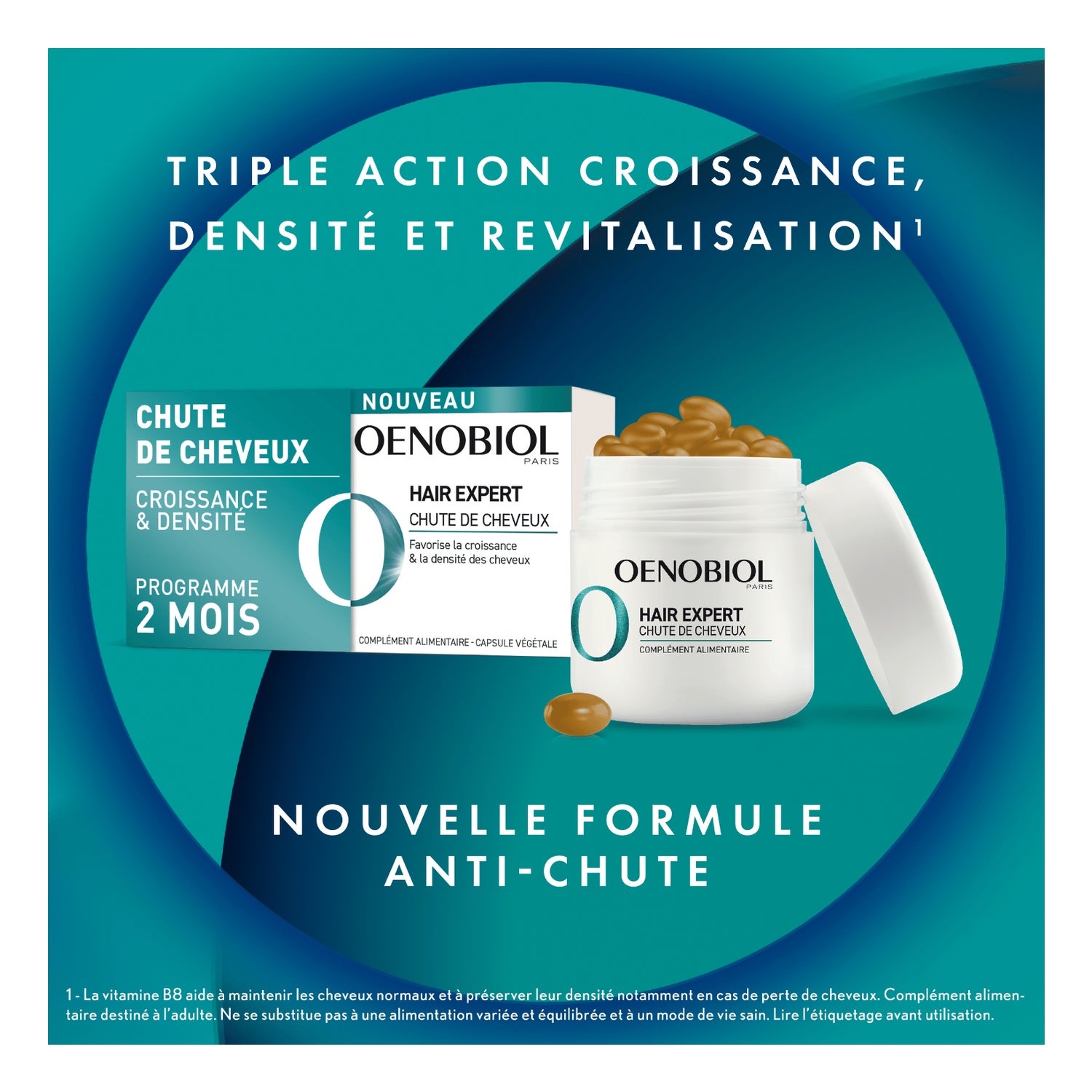 Oenobiol Hair Expert Chute de Cheveux 2x30 Capsules est un complément alimentaire en capsules végétales, formulé avec les vitamines C, B2, B3, B5, B6 et B8 (biotine).