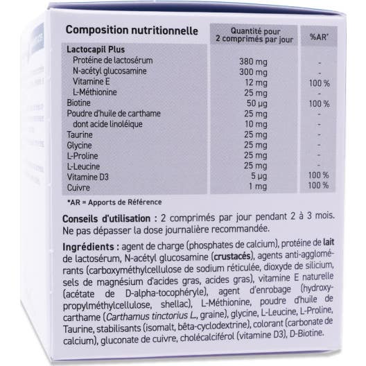 Oenobiol Hair Expert Chute de Cheveux Anti-Âge est un complément alimentaire conçu pour soutenir la santé des cheveux. Ce produit présente une formule innovante qui inclut le complexe Lactocapil Plus, composé de :