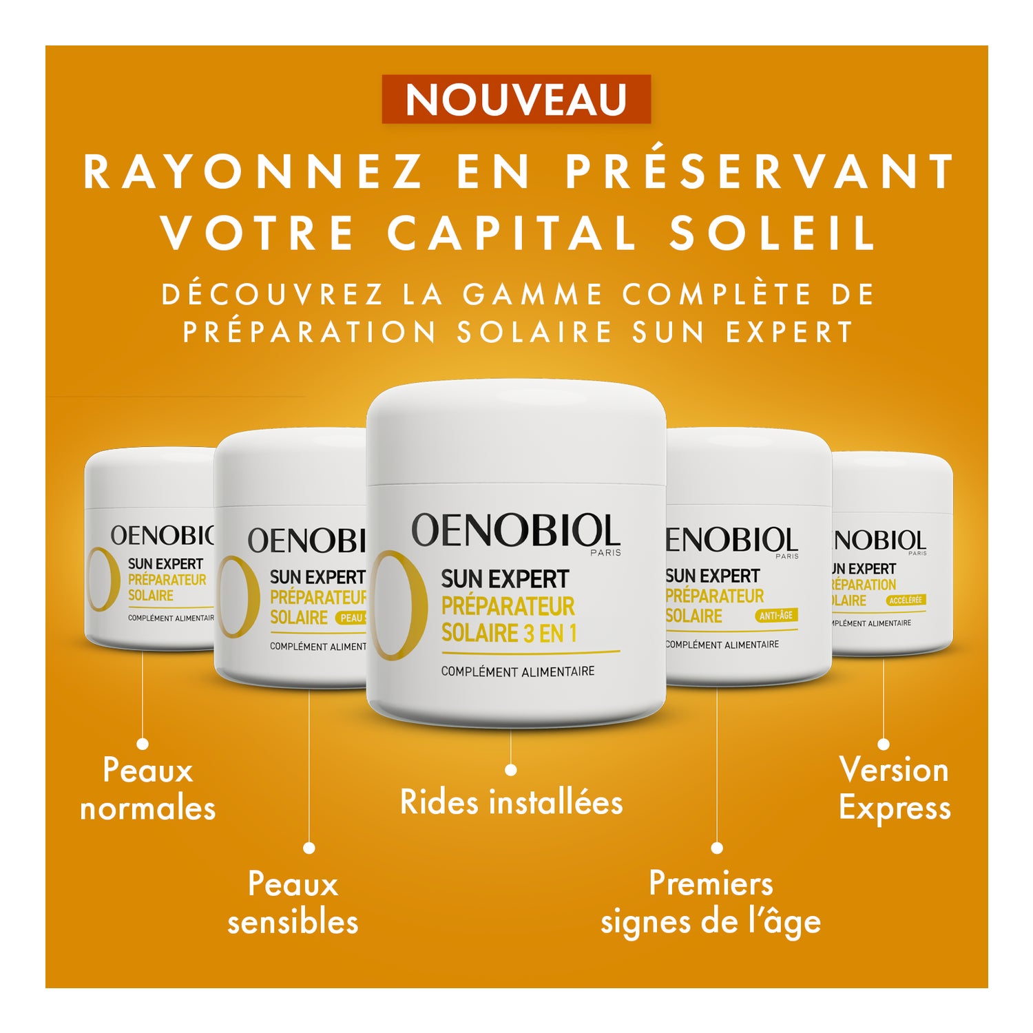 Oenobiol Sun Expert Préparateur Solaire 3 en 1 2x30 Capsules est un complément alimentaire spécialement formulé pour préparer la peau à l'exposition solaire.
