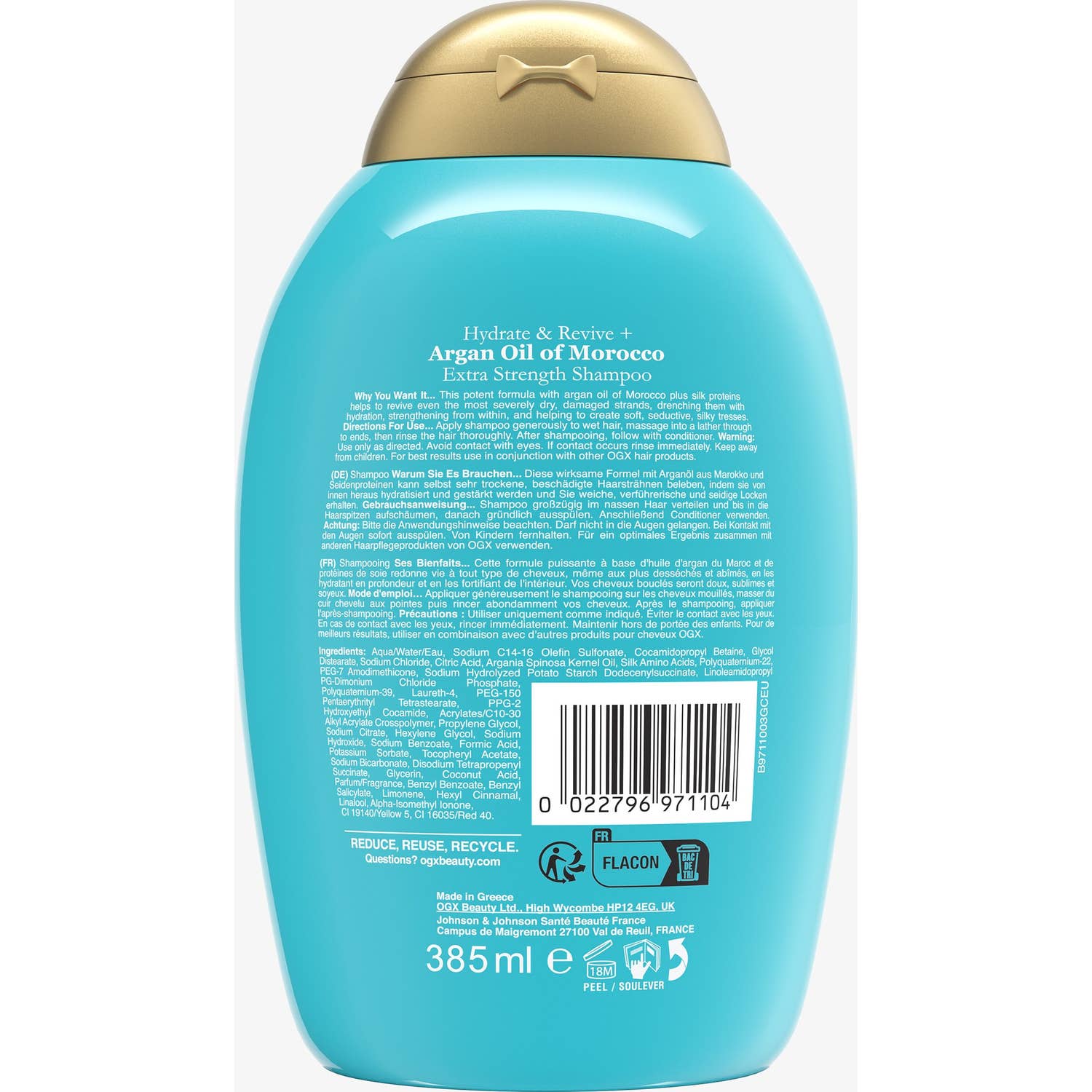 Ogx Hydrate & Repair Extra Strength Hair Shampooing Argan Oil 385ml est un shampooing qui aide à nettoyer les cheveux secs, abîmés et/ou cassants tout en aidant à les réparer