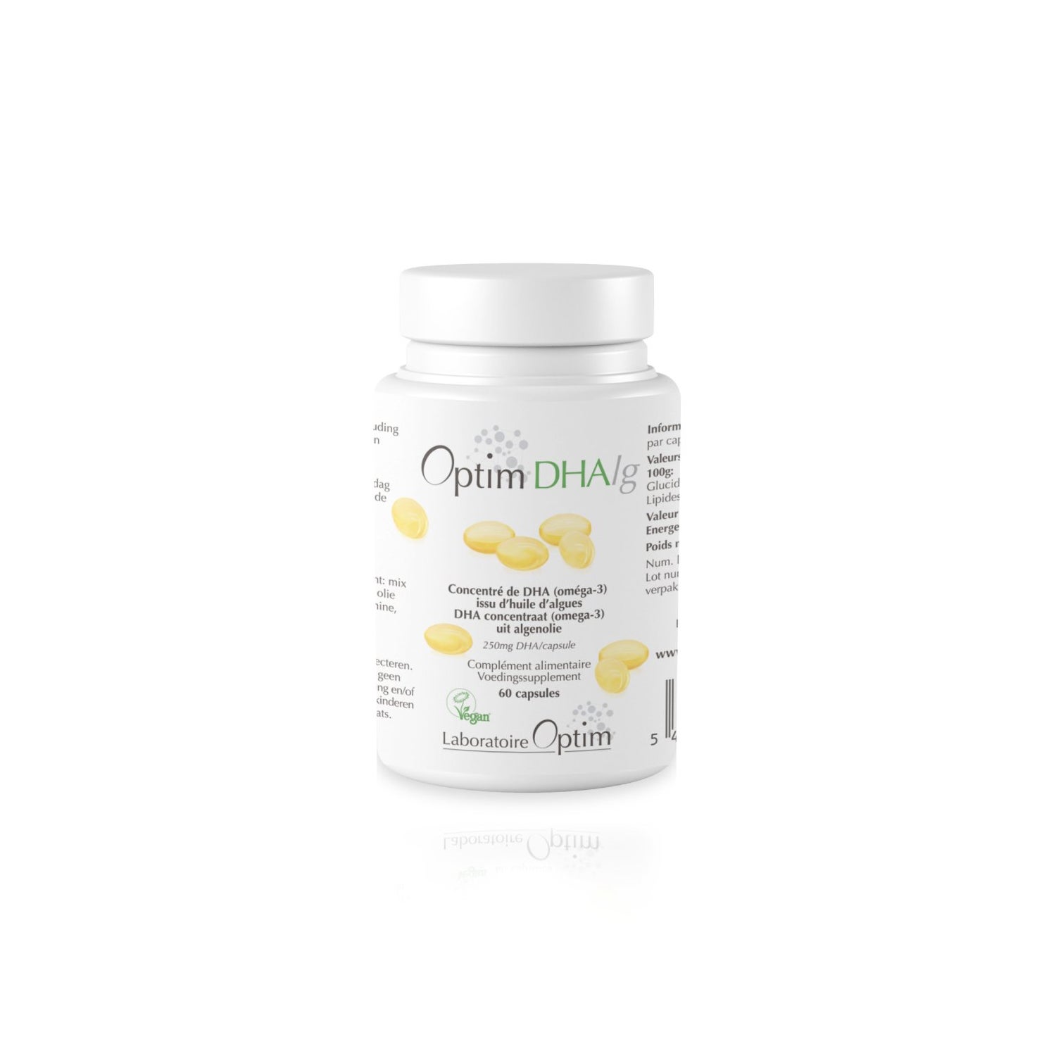 Chaque capsule végétale de Optim DHArg contient 250 mg de DHA extrait de microalgues (Schizochytrium sp.). Le mélange breveté d'antioxydants protège l'huile pour une conservation optimale des oméga-3.