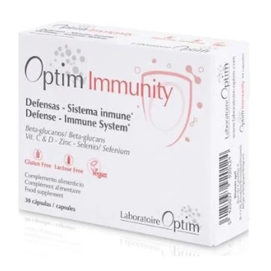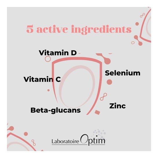 Complément alimentaire sous forme de capsules, élaboré à base de bêta-glucanes provenant d'une souche de levure de saccharomyces, vitamines C et D, zinc et sélénium, qui est indiqué pour aider à renforcer le système immunitaire.