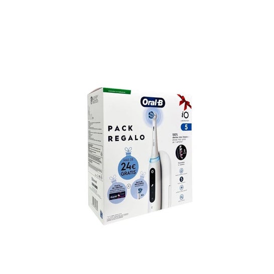 Oral-B Pack Io5 Laboratory 2 Brossettes + Recharges + Dentifrice pour l'hygiène buccale quotidienne comprend deux brosses à dents électriques iO5 avec technologie magnétique iO, des recharges Ultimate Clean et du dentifrice. C'est une solution complète pour l'hygiène buccale quotidienne des adultes.