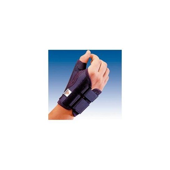 Attelle de poignet composée d'une base en textile respirant et d'une couche de coton en contact avec la peau permettant la libre circulation des doigts. L'attelle de pouce est fabriquée en aluminium malléable et comporte deux renforts dorsaux en plastique. En outre, l'attelle de pouce a un design semi-circulaire, ce qui augmente le confort et améliore le positionnement.