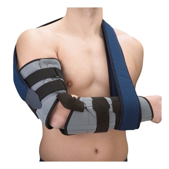 Orthèse de coude avec une attelle palmaire et un contrôle des fléchisseurs-extenseurs du coude, composée d'une coque de bras et d'avant-bras qui sont reliés entre eux par une articulation monocentrique, qui a la possibilité de régler la flexion et l'extension de 0° à 90° par intervalles de 15° par 15°. Il est particulièrement adapté pour immobiliser et ajuster le bras à des degrés spécifiques.