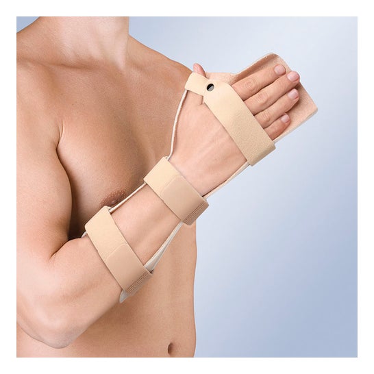 Attelle d'immobilisation pour la main conçue par Orliman. Il existe des modèles pour la main gauche et la main droite, conçus avec un matériau thermoplastique. En outre, sa face intérieure contient un tissu éponge absorbant, qui assure le confort et empêche la transpiration. Les sangles sont réglables pour s'adapter au poignet et à l'avant-bras, et il y a une épingle de sûreté en velours pour le pouce. Sa fonction est de limiter la mobilité du poignet, de la main et des doigts, en les maintenant avec une petite flexion par rapport au pouce.