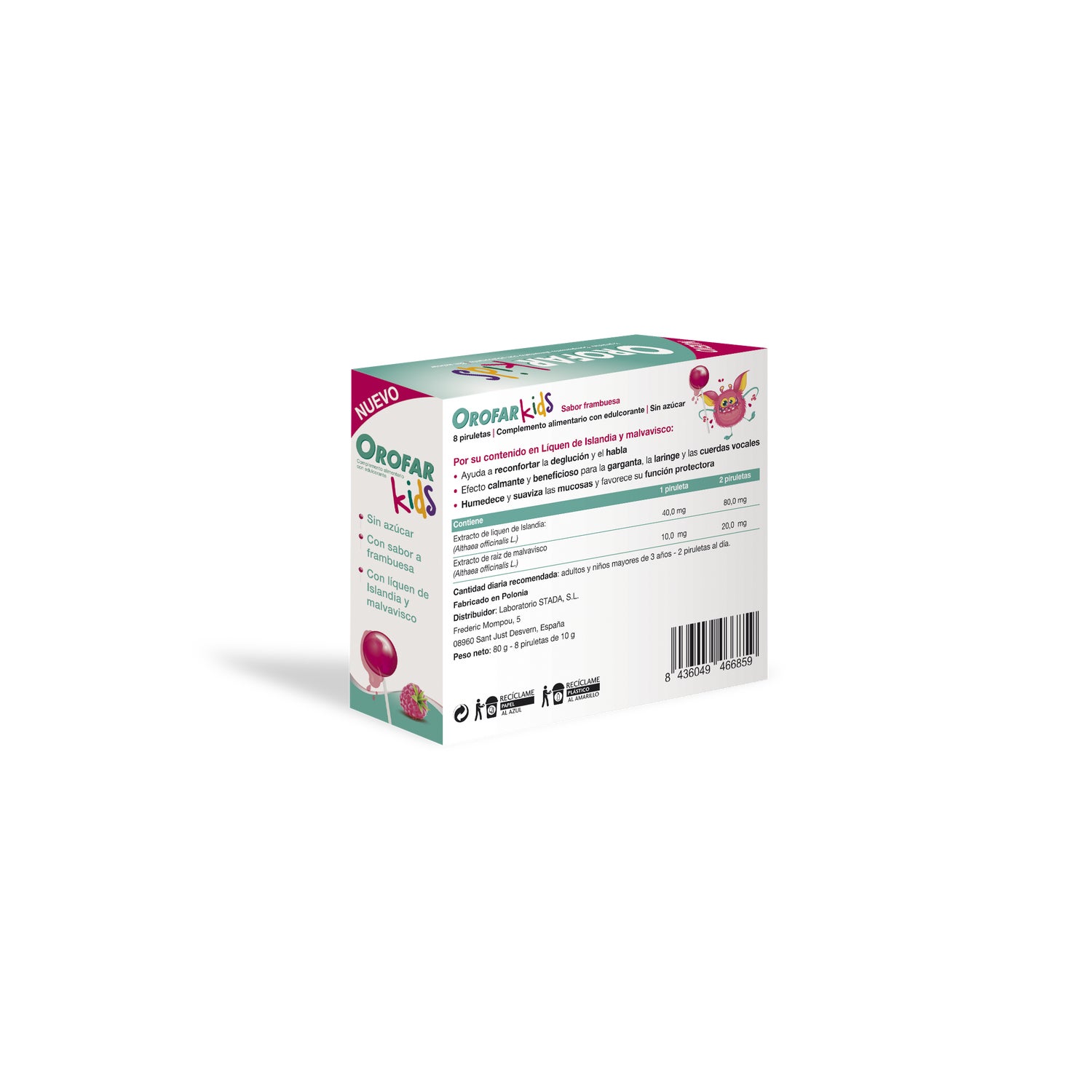 Format amusant : Huit sucettes irrésistibles qui feront que les enfants voudront les prendre ! OROFAR Kids a été conçu spécifiquement pour les enfants et les adultes, offrant un soulagement efficace pour les démangeaisons de la gorge, du larynx et des cordes vocales. Son goût irrésistible de framboise et sa présentation sous forme de sucettes en font un favori pour les plus petits.