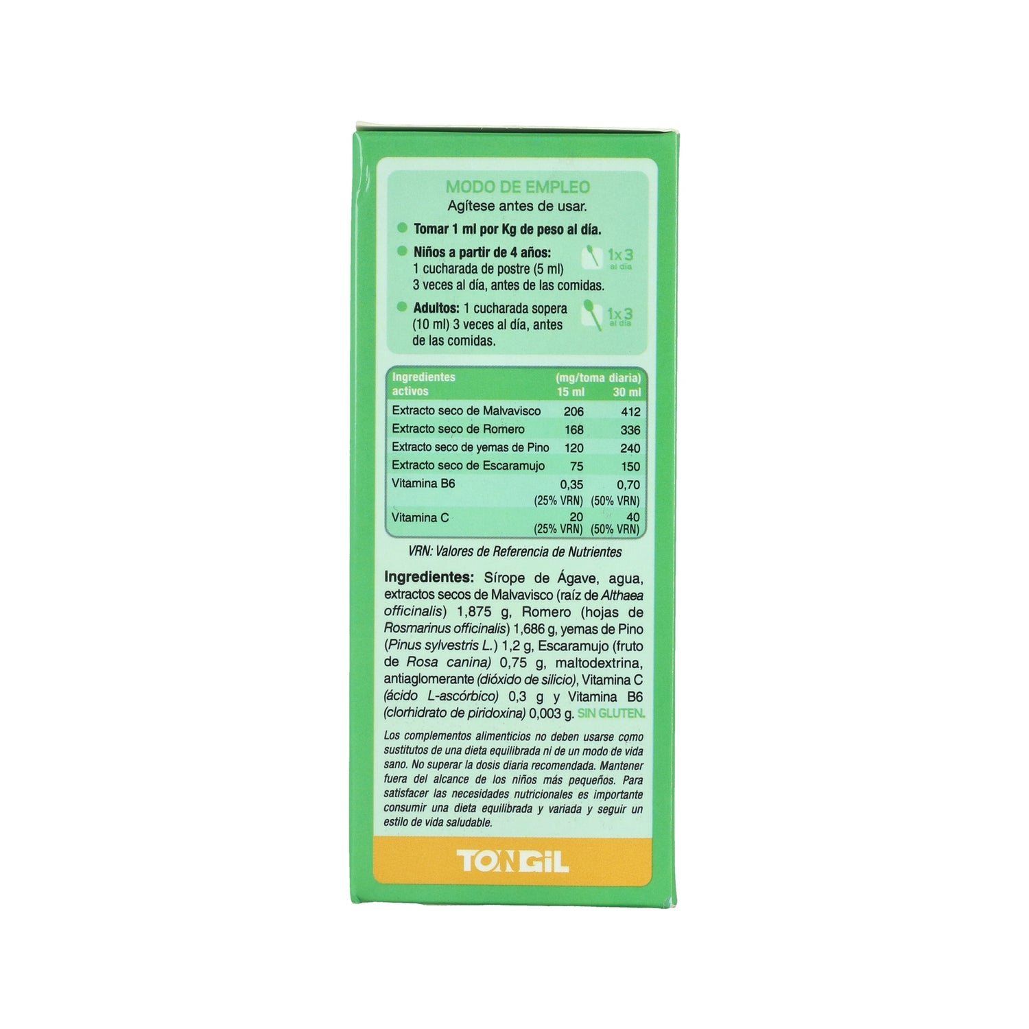 Sirop d'agave, eau, extraits secs de guimauve (Althaea officinalis root) 1,875 g, de romarin (Rosmarinus officinalis leaves) 1,686 g, de bourgeons de pin (Pinus sylvestris L.) 1,2 g, Rose musquée (fruit de Rosa canina) 0,75 g, maltodextrine, anti-agglomérant (dioxyde de silicium), Vitamine C (acide L-ascorbique) 0,3 g et Vitamine B6 (chlorhydrate de pyridoxine) 0,003 g.
