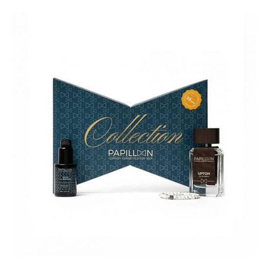 Papillon Collection Pack Upton + Sérum Skin And Beard SPF15 est un ensemble de soins pour la barbe et la peau qui comprend trois produits : Serum SPF 15 Beard & Skin 30 ml, Parfum Upton 50ml et un bracelet.