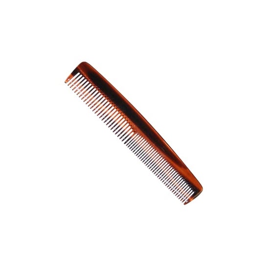 Peigne en coquille de coiffeur, un produit dont le matériau et la qualité conviennent à un usage professionnel. Le peigne en coquille du coiffeur a différentes fonctions lors des soins et de la coupe des cheveux. Le dessin a une longueur de 13,8 cm et est fini en brun et noir profond.