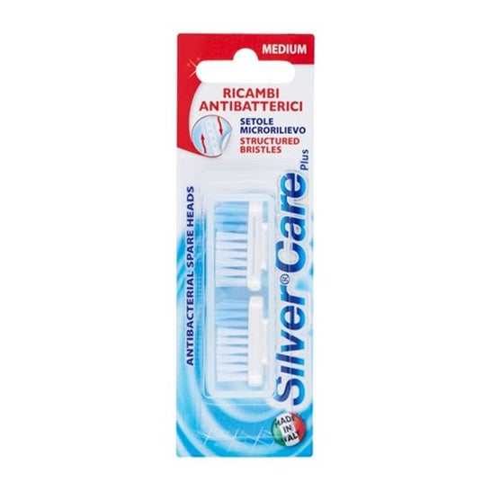 Remplacement de Tête Moyenne Silver Care de Perfetti Van Melle 2 unités offre des poils avec un brin interdentaire en relief pour une sensation unique dans la bouche.