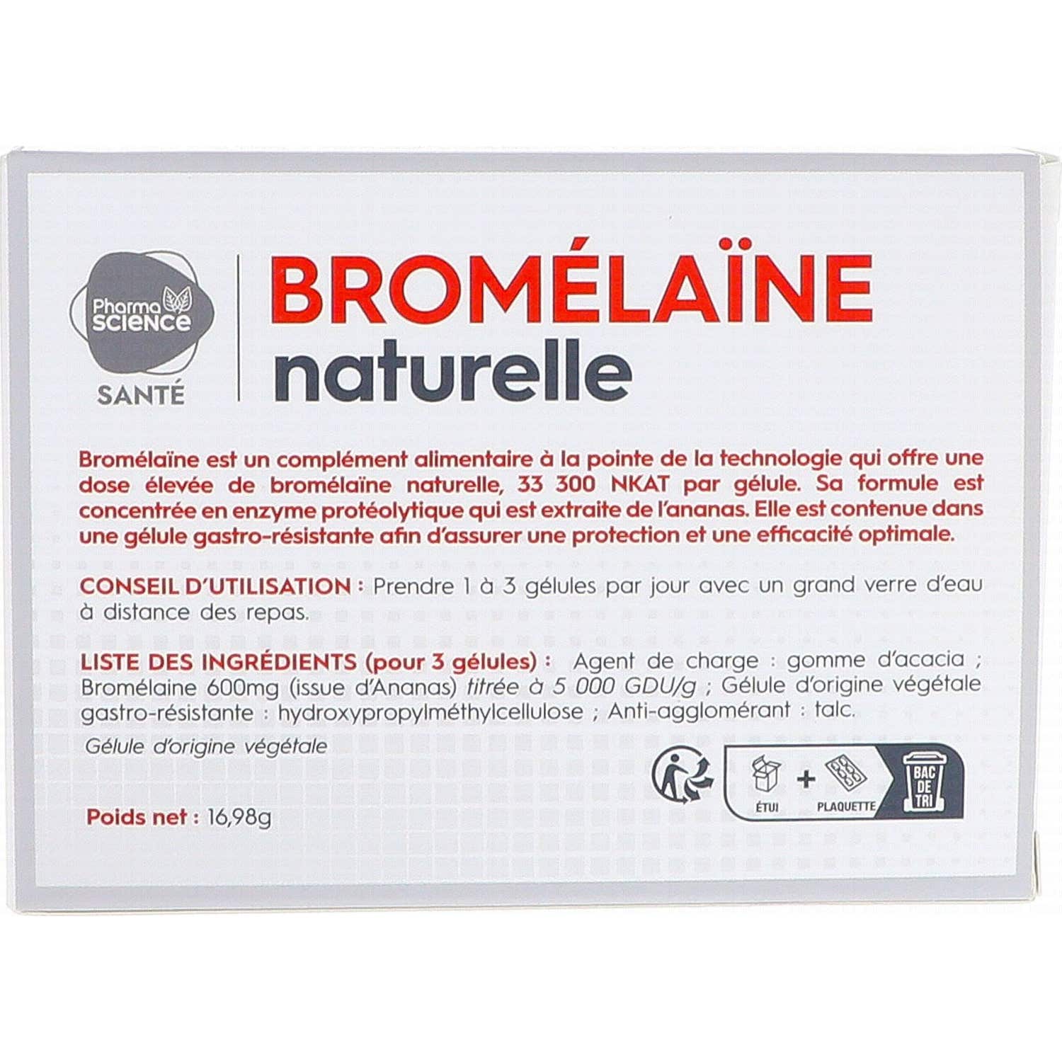 Pharmascience Broméline Naturelle 30caps est un complément alimentaire élaboré à partir d'extraits naturels d'ananas frais. Cette protéine naturelle joue un rôle important dans la conversion des protéines ingérées en acides aminés, facilitant ainsi leur digestion. Ce produit provient du laboratoire Pharmascience, connu pour offrir une variété de produits naturels de haute qualité.