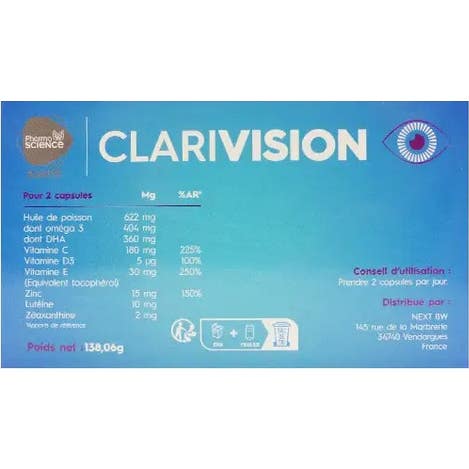 Pharmascience Clarivision Comfort Visuel est un complément alimentaire conçu pour favoriser le fonctionnement normal de la vision. Sa formule se compose d'ingrédients sélectionnés qui apportent des bénéfices significatifs.