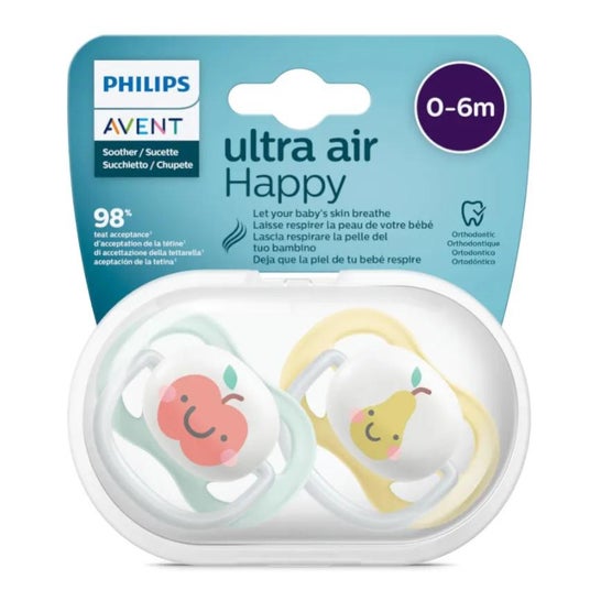 Sucette légère et respirante pour les peaux sensibles, de forme anatomique et sans BPA. Avec ses 4 trous d'aération extra-larges, elle permet une circulation d'air maximale et permet à la peau sensible de bébé de respirer. Le bouclier Ultra Air est léger et présente des bords arrondis pour plus de confort. La tétine en silicone pliable a une texture soyeuse et apaisante et une forme symétrique qui prend soin du palais, des dents et des gencives de votre bébé pendant sa croissance. La stérilisation par micro-ondes est un procédé sûr et facile.