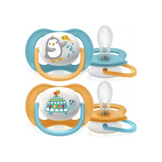 Sucettes pour bébés de 6 à 18 mois avec tétines anatomiques en silicone et anneaux phosphorescents.Ce pack contient deux unités, une sucette pour le jour et l'autre pour la nuit. Les deux sucettes ont un anneau, la différence étant que la sucette de nuit a un anneau luminescent qui permet de la trouver plus facilement dans l'obscurité.Sa tétine anatomique imite la forme du mamelon de la mère et s'adapte parfaitement au palais du bébé, lui apportant calme et confort.. ✓ La couleur et le design peuvent varier selon la disponibilité.