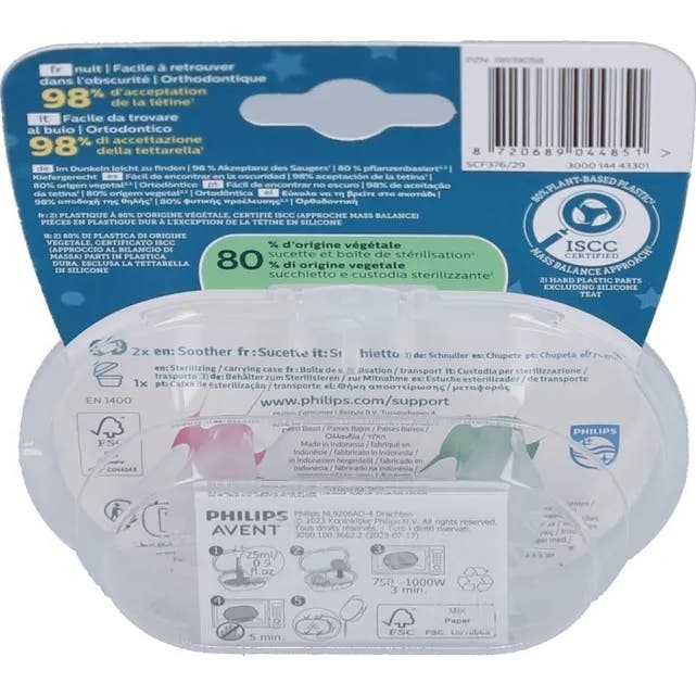 Un aspect remarquable de ce produit est son protecteur qui brille doucement dans l'obscurité, ce qui facilite sa localisation pendant la nuit. De plus, une boîte de transport est incluse, qui sert également de stérilisateur ; il suffit d'ajouter de l'eau et de chauffer au micro-ondes pendant 3 minutes pour garantir l'hygiène de la tétine.