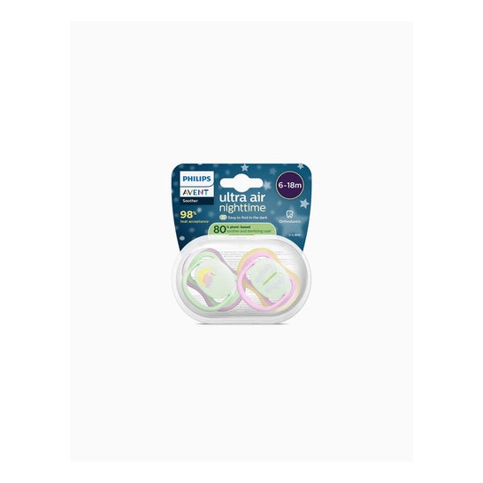 Philips Avent Ultra Air Nighttime Bird Butterfl 6-18M 2uds est un ensemble de deux tétines conçues pour offrir confort et fonctionnalité au bébé. Ces tétines disposent de larges orifices de ventilation, permettant à la peau du petit de respirer et de rester douce et sèche.