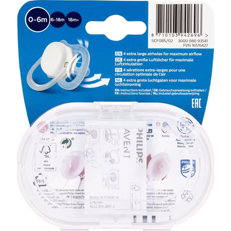 Le produit comprend une boîte de transport qui sert également de stérilisateur. Pour son utilisation, il faut ajouter de l'eau et chauffer au micro-ondes pendant 3 minutes. Cette tétine a été approuvée par la Oral Health Foundation. Pour des raisons d'hygiène, il est conseillé de la remplacer tous les 4 semaines. Elle est adaptée dès la naissance jusqu'à 6 mois.