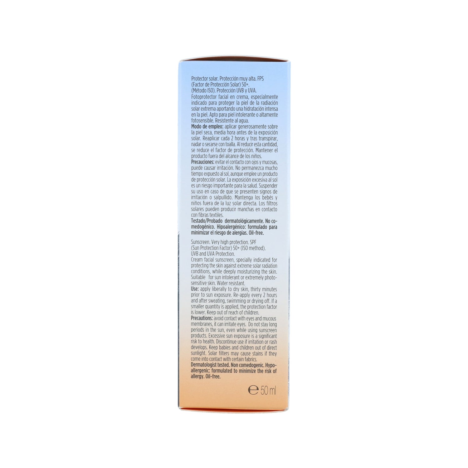 Crème solaire pour le visage convenant à tous les types de peau, y compris les peaux intolérantes et hautement photosensibles. Sa formule offre une très haute protection contre les rayons UVB et UVA et une hydratation intense dans des conditions de rayonnement solaire extrême, comme lors de la pratique de sports de plein air, procurant une sensation de confort très agréable sur la peau sans laisser de brillance. Il est résistant à l'eau.