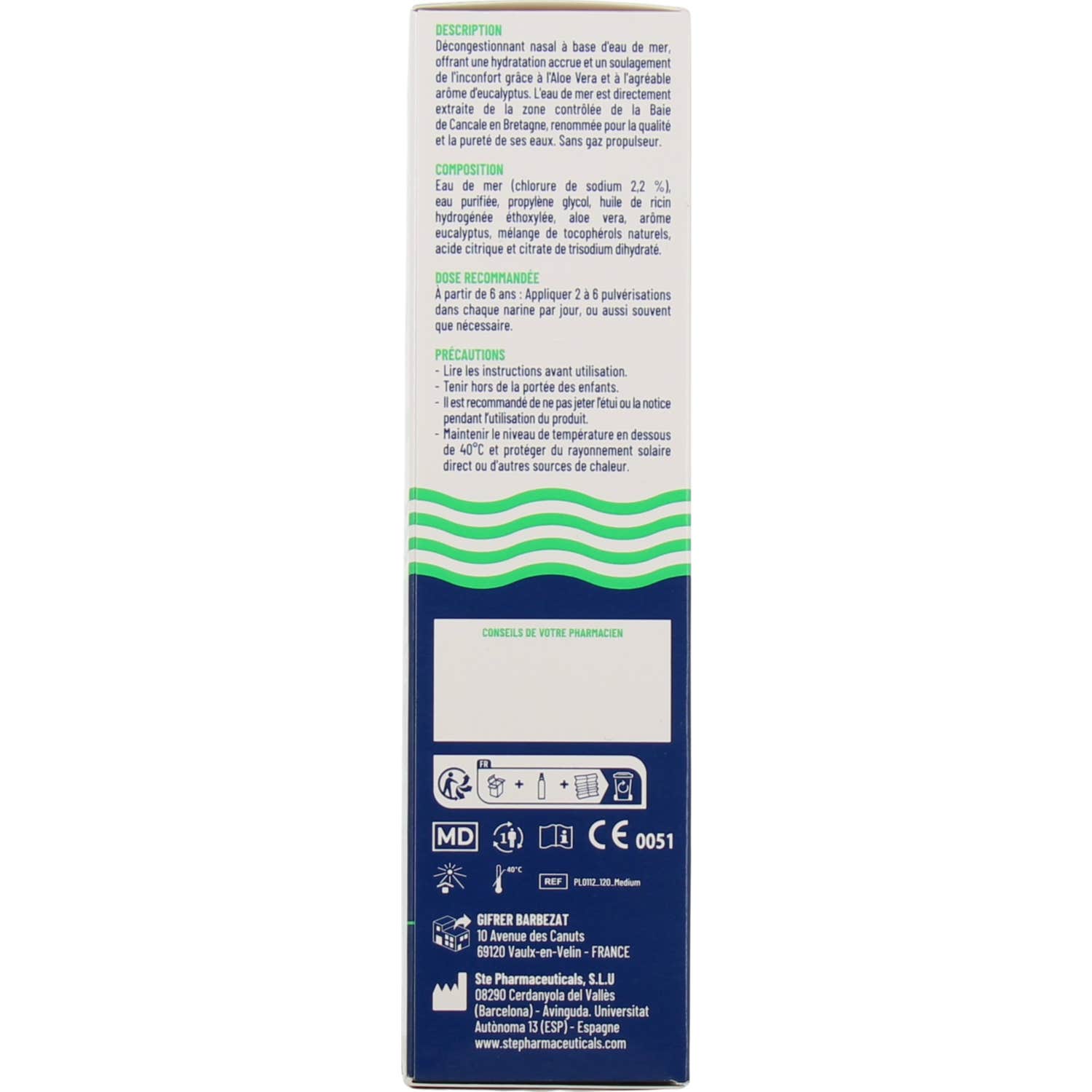 La formule de ce spray est composée à 98,5% d'ingrédients d'origine naturelle. L'eau de mer utilisée est extraite directement de la Baie de Cancale en Bretagne, connue pour la pureté de ses eaux. L'inclusion d'Aloe Vera permet une hydratation profonde et l'eucalyptus offre une agréable sensation de fraîcheur et un soulagement immédiat de l'inconfort nasal.