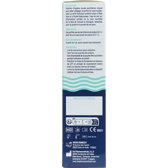 Physiologica Spray Nasal Aloe Vera & Acide Hyaluronique est un dispositif médical conçu pour le lavage nasal et l'hydratation prolongée de la muqueuse des fosses nasales. Cette solution isotonique, élaborée à partir d'eau de mer de la baie de Cancale, est adaptée à toute la famille, à partir d'un an, et ne contient pas de conservateurs.