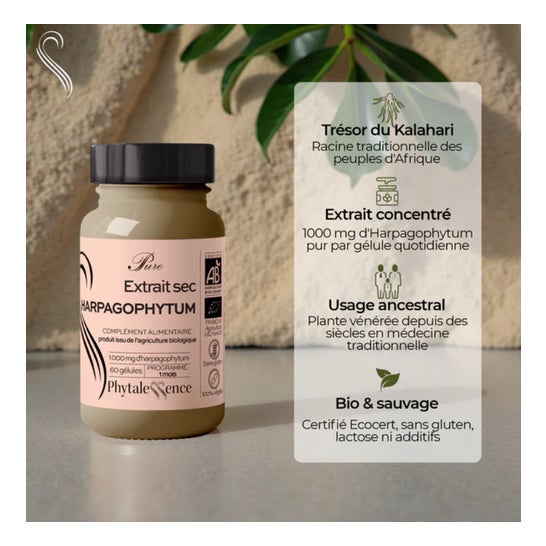 Phytalessence Pure Harpagophytum Bio 60 Gélules est un complément alimentaire à base d'extrait sec d'harpagophytum, qui aide à maintenir la santé des articulations et une bonne mobilité.