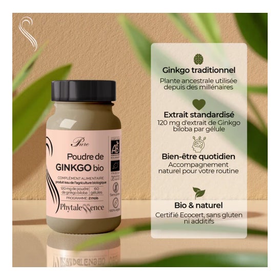 Phytalessence Pure Ginkgo Bio 60 Gélules est un complément alimentaire à base d'extrait de ginkgo biloba.