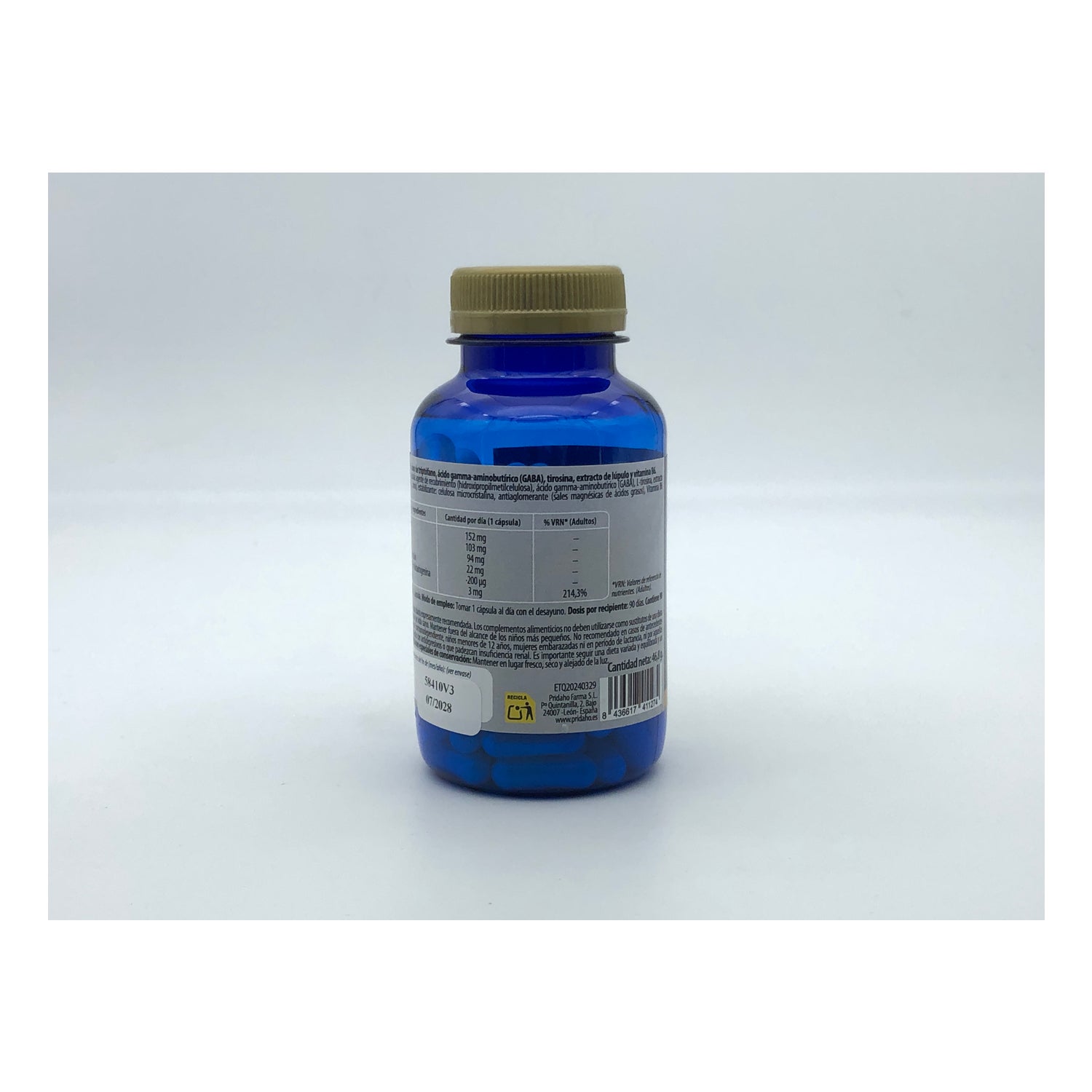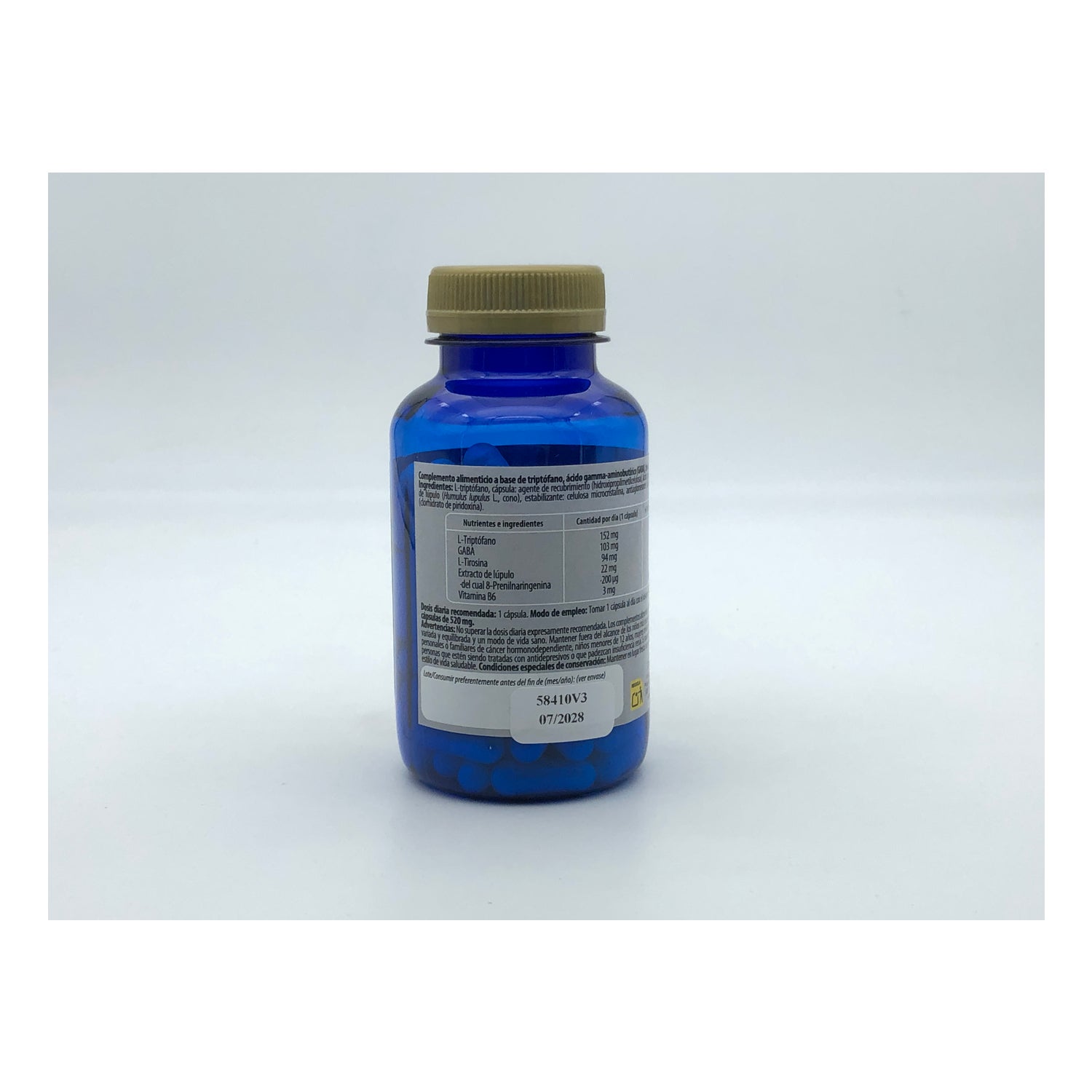 Avertissements : Ne pas dépasser la dose quotidienne expressément recommandée. Les compléments ne doivent pas être utilisés comme substituts d'une alimentation variée et équilibrée et d'un mode de vie sain. Tenir hors de portée des jeunes enfants. Non recommandé en cas d'antécédents personnels ou familiaux de cancer hormonodépendant, chez les enfants de moins de 12 ans, chez les femmes enceintes ou allaitantes, ni par les personnes traitées avec des antidépresseurs ou souffrant d'insuffisance rénale. Il est important de suivre une alimentation variée et équilibrée et un mode de vie sain. Conditions spéciales de conservation : Conserver dans un endroit frais, sec et à l'abri de la lumière.