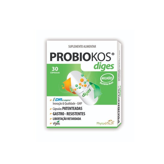 Phytogold Probiokos Diges est un complément alimentaire qui présente une formule intégrale composée d'enzymes digestives et de probiotiques. Ce produit est conçu pour contribuer à l'équilibre de la flore intestinale et optimiser le processus de digestion de :