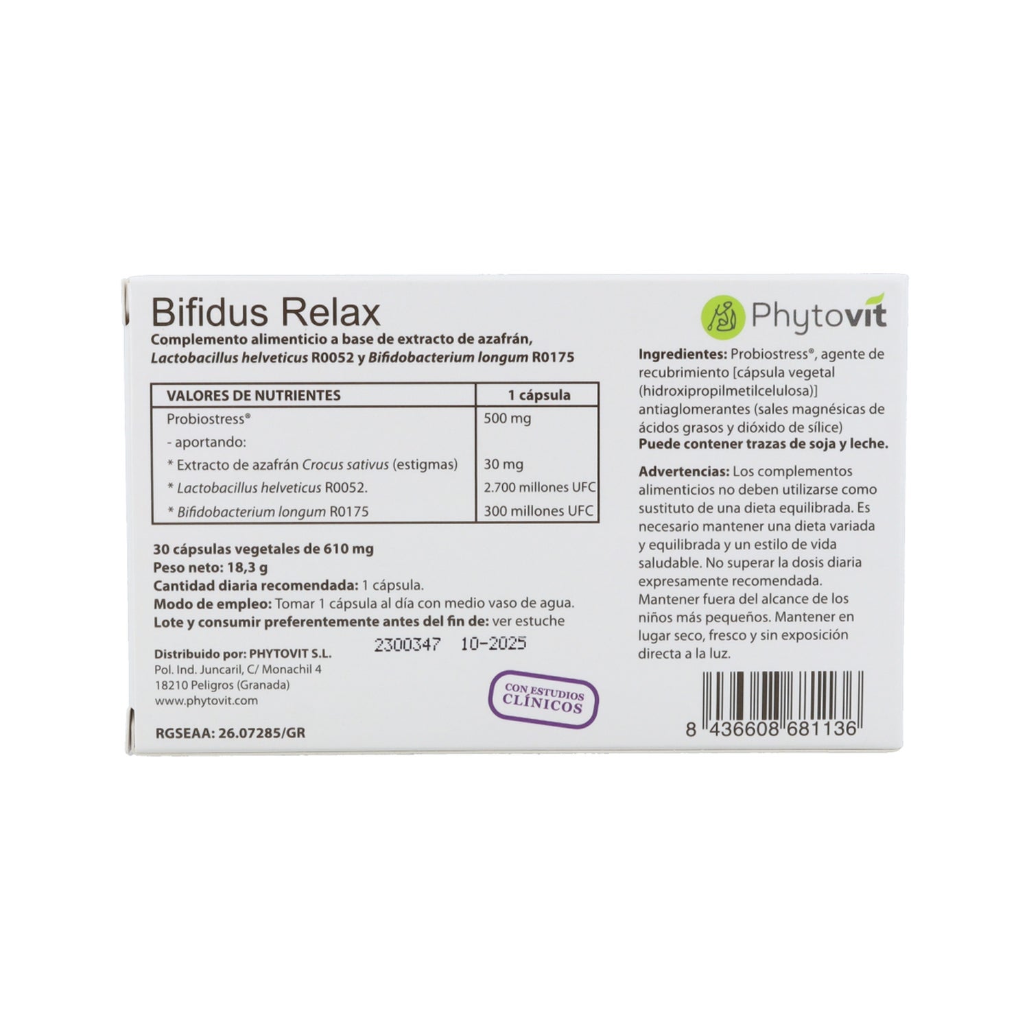 500 mg de Probiostress® (30 mg d'extrait de safran, 2 700 UFC de lactobacillus helveticus R0052 et 300 millions d'UFC de bifidobacterium longum R0175).
