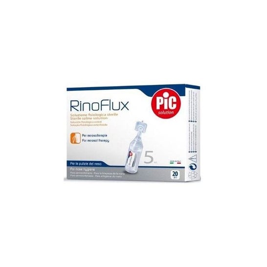 Pic Solution Physiologique Rinoflux 5 Ml 20 Ud est une solution physiologique destinée à l'hygiène quotidienne de votre nez et de celui de vos petits. Elle peut être utilisée en aérosolthérapie ou seule pour dégager le nez. Il peut également être utilisé avec une douche nasale. Il aide à éliminer le mucus et les sécrétions nasales, ce qui permet de dégager le nez. Vous respirerez mieux et pourrez prévenir l'encombrement des voies respiratoires et profiter d'un nez dégagé. Son action fluidifiante et humidifiante permet de débarrasser le nez des sécrétions et des mucosités. Mais il a d'autres utilisations, tant individuellement qu'en combinaison avec la douche nasale.