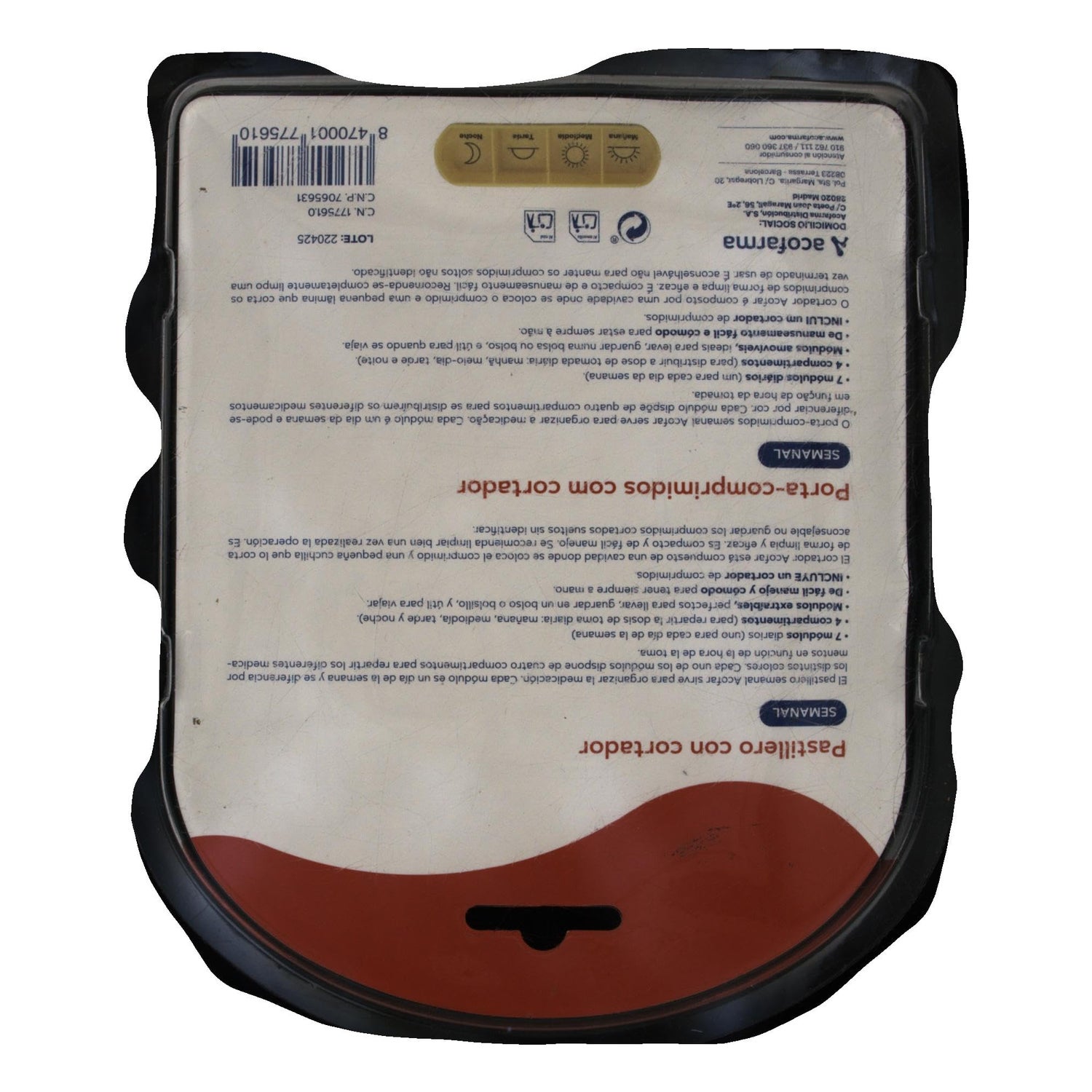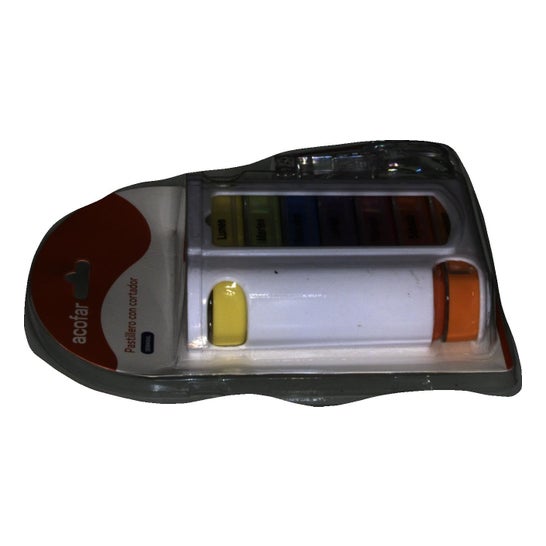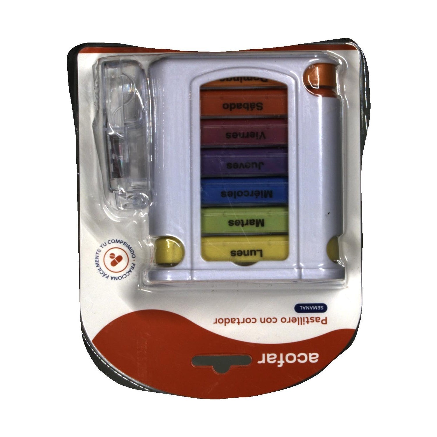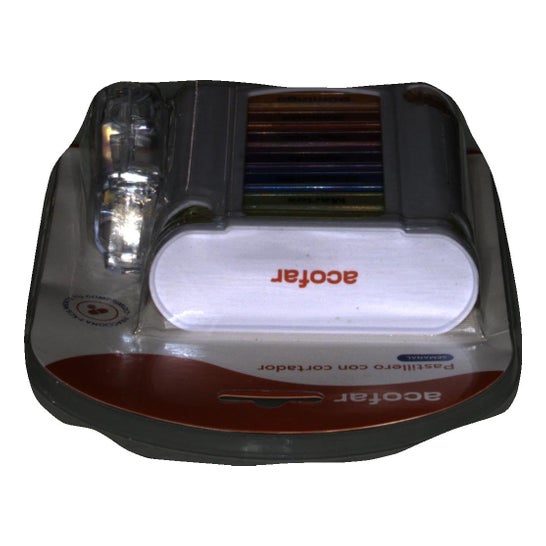 Acofar Weekly Pill Box with Cutter est un pilulier avec 7 modules de couleurs différentes et avec les jours de la semaine qui aide à contrôler et réguler la prise de médicaments. Il comprend également un cutter pour couper les comprimés de manière efficace, propre et sûre.