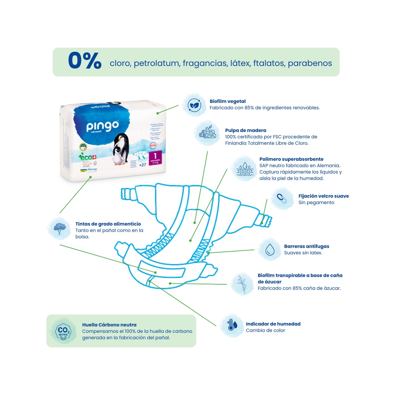 PingoPingo Ecological Nappies T1 Newborn 27 pcs. est un ensemble de couches écologiques qui aident à garder la peau de bébé sèche et confortable.