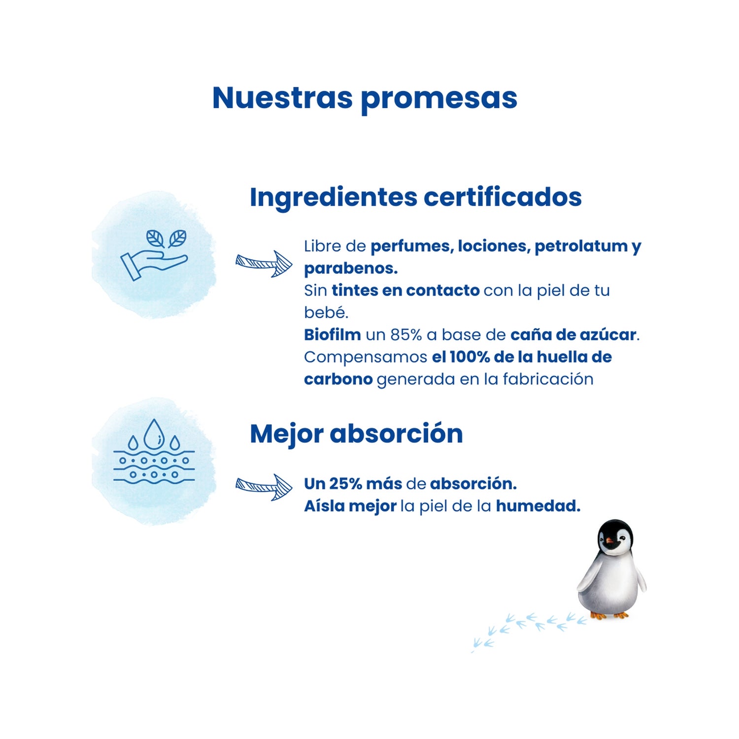 Conçue avec un noyau absorbant qui garde la peau de l'enfant sèche jour et nuit, elle est adaptable et s'adapte à la morphologie de l'enfant tout en lui laissant une grande liberté de mouvement. Elle possède également des barrières anti-fuites, est douce pour la peau délicate du nouveau-né et possède un indicateur d'humidité avec un changement de couleur pour assurer le confort de l'enfant.