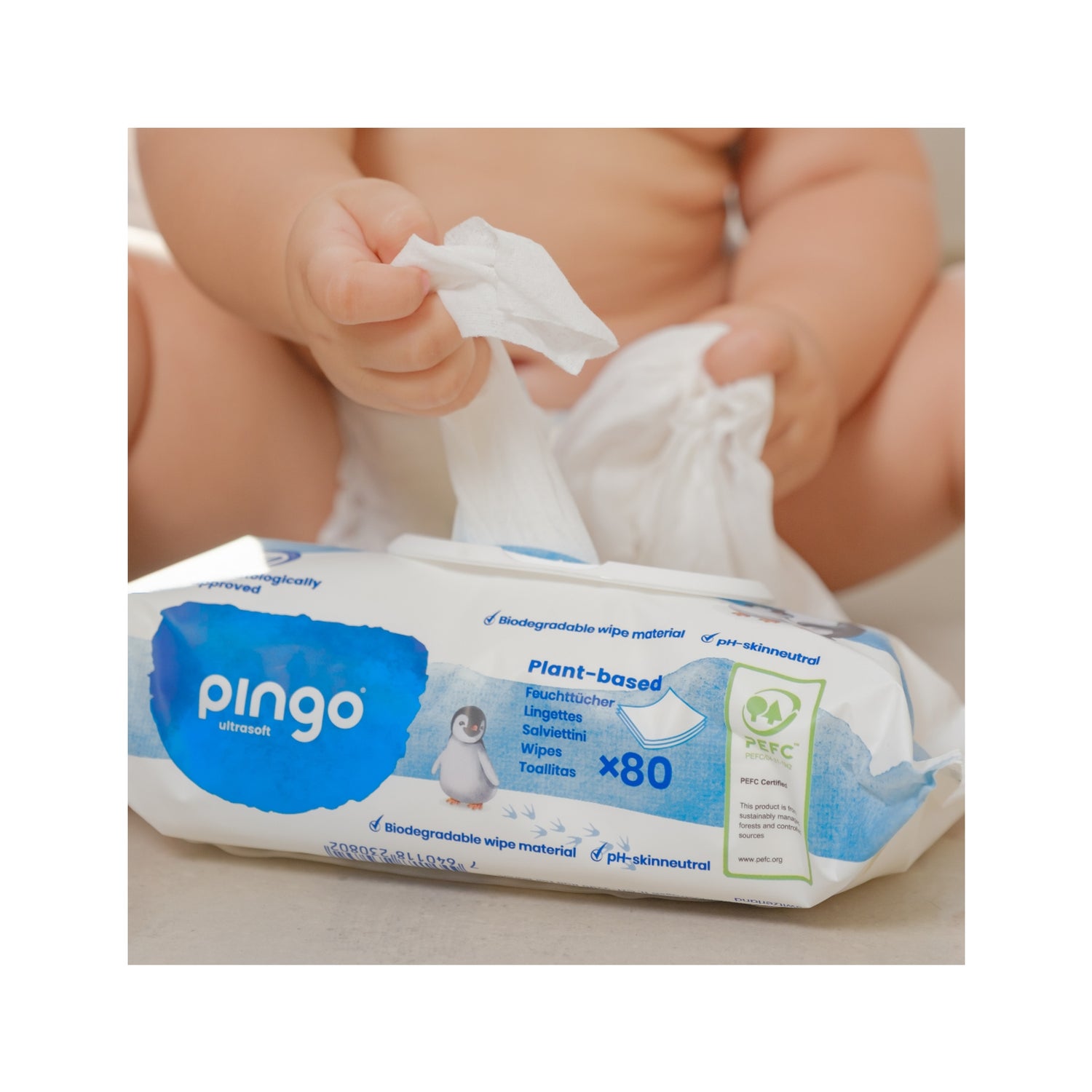 Fabriquées à partir de cellulose issue de l'agriculture biologique et exemptes de composants toxiques, les lingettes Pingo offrent une grande tolérance pour tous les types de peau. Le tissu solide et doux pour la peau est composé de 50 % de cellulose, de 30 % de polyester et de 20 % de polypropylène. En outre, l'emballage des lingettes est composé à 40 % de matériaux recyclés.