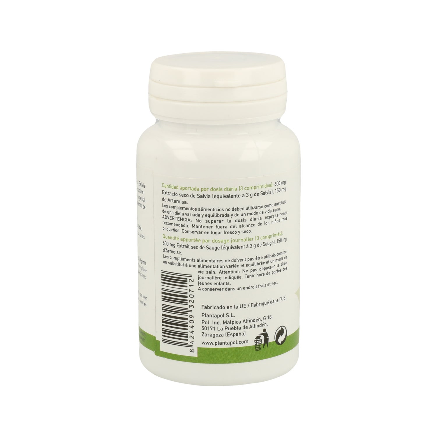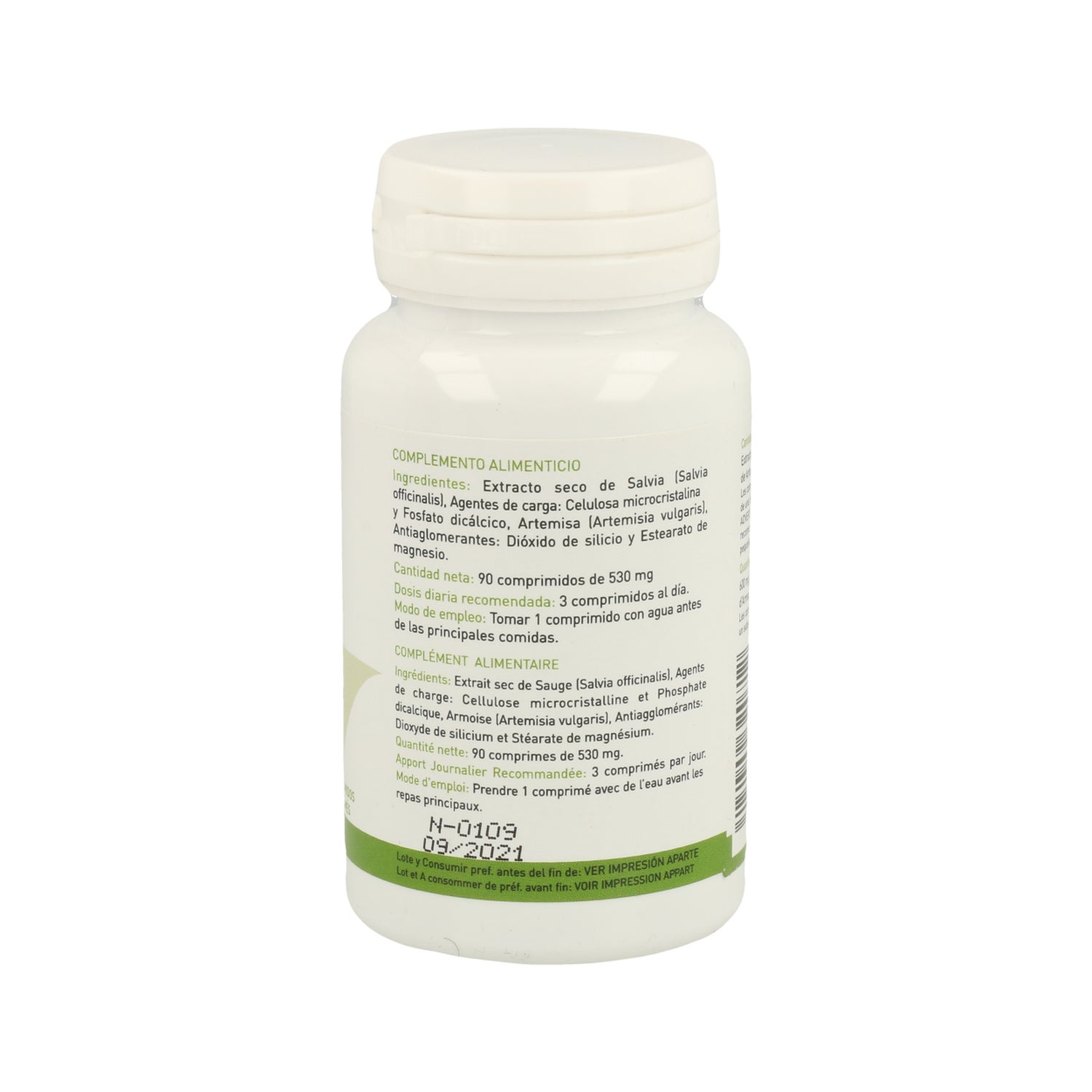 Extrait sec de Sauge (Salvia officinalis), d'Armoise (Artemisia vulgaris), Agents de charge : Cellulose microcristalline et phosphate dicalcique, Antiagglomérants : Dioxyde de silicium et stéarate de magnésium.