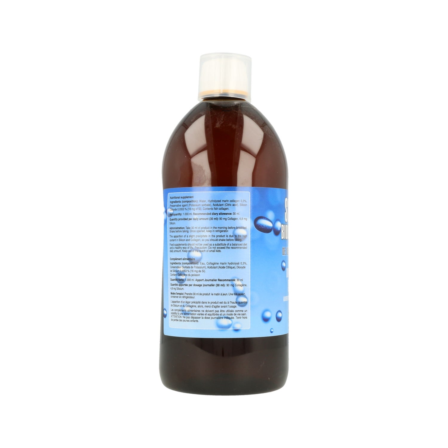Le silicium liquide, aux propriétés thérapeutiques, entre autres fonctions importantes, préserve la santé de nos tissus, maintient l'élasticité de nos articulations et agit comme un puissant antioxydant pour la peau. Il joue un rôle important dans le développement des os et est essentiel pour l'assimilation du calcium. Il prévient également la déminéralisation.