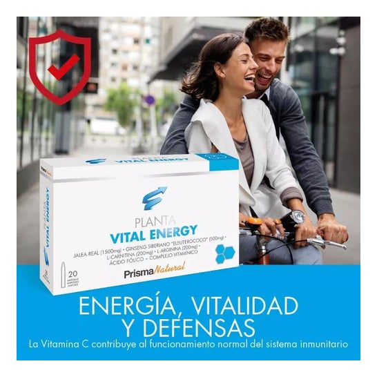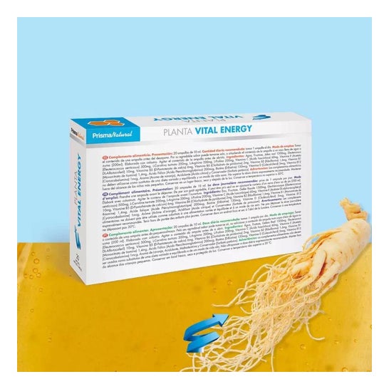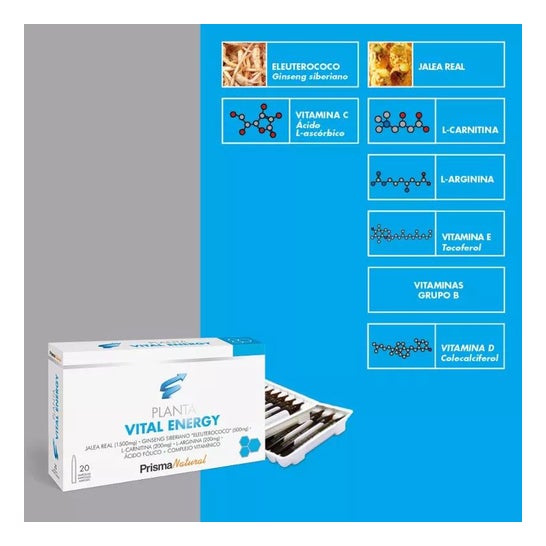 Plantavital Energy 20 Amp 10Ml Prisma Natural est un complément alimentaire de Prisma Natural qui associe de la gelée royale, de l'éleuthérocoque, des acides aminés et des vitamines. Il est formulé pour lutter contre la fatigue et le stress, ainsi que pour favoriser le bien-être physique et mental général. Ce produit contribue à augmenter la vitalité et l'énergie, en apportant des nutriments essentiels à l'organisme. Il contribue également à améliorer la digestion et à réduire l'inflammation abdominale. Il est particulièrement recommandé aux personnes qui souhaitent renforcer leur santé et maintenir un mode de vie actif et sain.