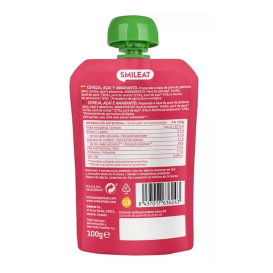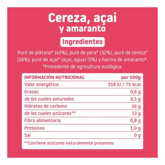 Pack buvable composé de cerise, d'açai et d'amarante, parfait pour les petits-déjeuners, les collations ou les goûters des enfants à partir de 8 mois. Sa texture douce et facile à boire favorise le développement nutritionnel des petits car elle ne contient pas de lait, d'œuf, de gluten, d'additifs ou de sucres ajoutés. En outre, l'emballage à base de plantes est respectueux de l'environnement.