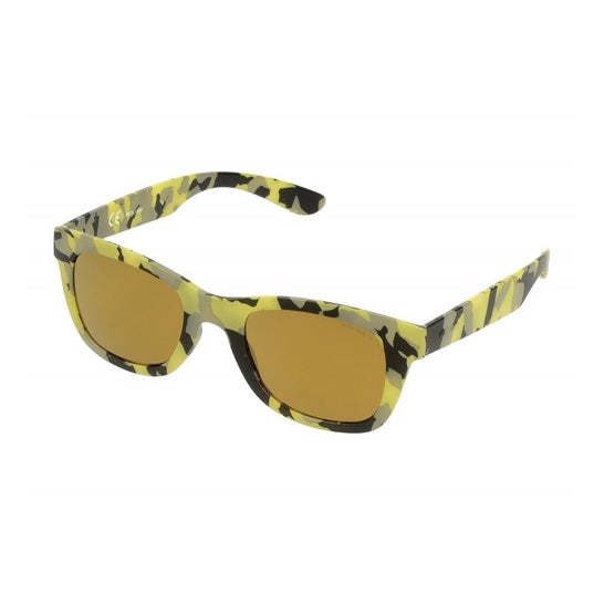 Lunettes de soleil avec monture carrée en acétate imprimé camouflage jaune et verres polarisants avec filtres UV de catégorie 2. Aide à protéger les yeux des rayons du soleil et à prévenir la fatigue visuelle. Branches de 140 mm, pont de 22 mm et verres de 50 mm. Convient aux adultes.