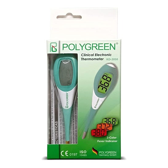 Thermomètre clinique qui permet de mesurer la température avec une lecture rapide de 10 secondes. Il possède un embout flexible, est étanche, comprend une alarme de fièvre et un écran rétro-éclairé. Le thermomètre affiche également la fièvre en trois couleurs différentes.