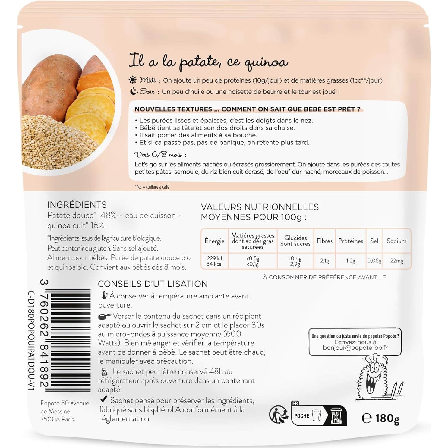 Popote Purée de Patate Douce et Quinoa +8M Bio 180 g est un aliment conçu pour t'accompagner dans l'exploration de nouvelles textures à partir de 8 mois. Cette purée a été élaborée avec des ingrédients bio, garantissant la qualité et le goût naturel à chaque bouchée.