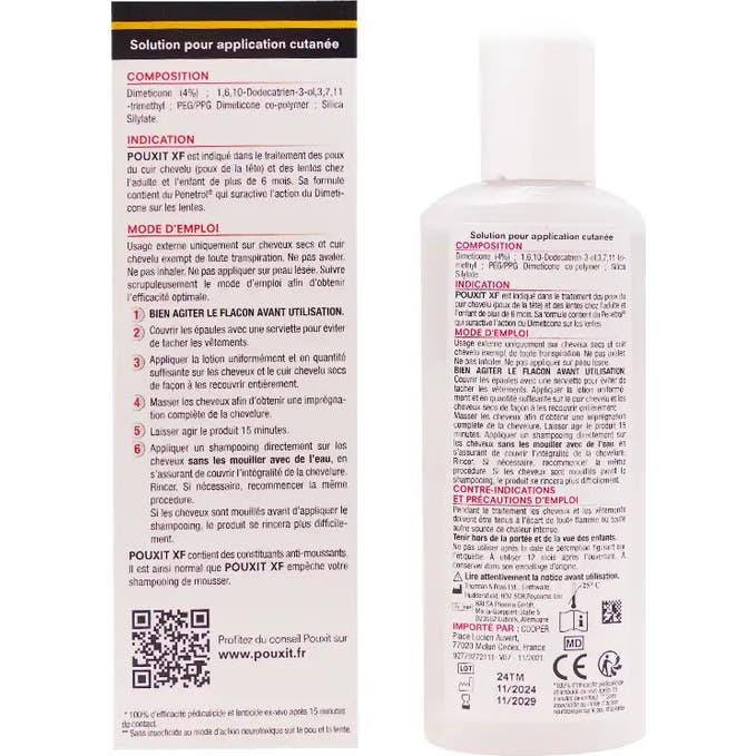 Pouxit Xf Lotion Anti-Poux et Lentes est un traitement conçu pour l'élimination des poux et des lentes, adapté aux adultes et aux enfants de plus de six mois. Ce produit se caractérise par sa formule sans insecticides à action neurotoxique, agissant de manière physique pour éliminer ces parasites.