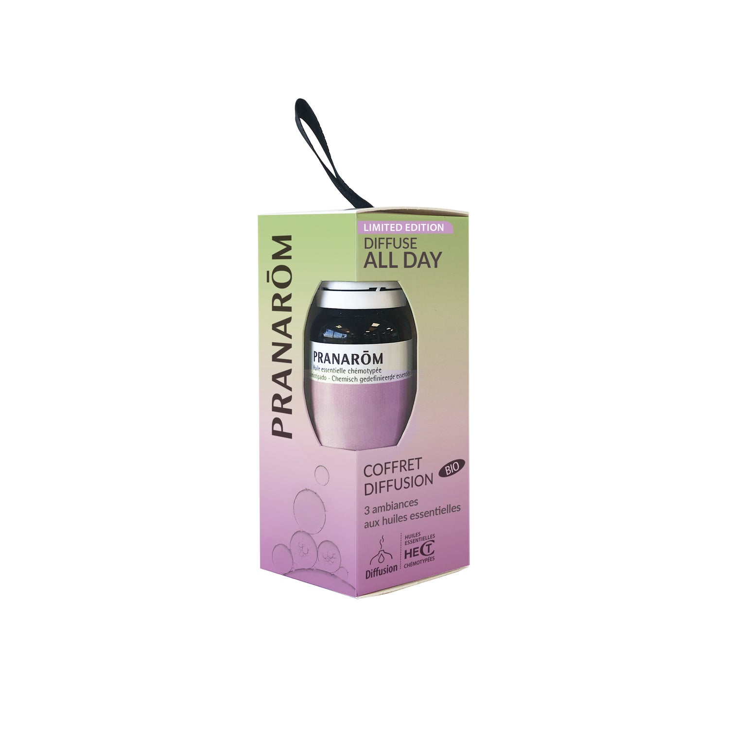 Le laboratoire Pranarôm s'est développé depuis plus de 30 ans et est aujourd'hui l'expert incontesté en solutions innovantes élaborées à partir d'huiles essentielles BIO 100% naturelles, 100% pures (non mélangées avec des huiles de qualité inférieure) et 100% intègres (non altérées, non décolorées, non rectifiées), pour prendre soin de soi autrement. Pranarôm garantit l'accès aux meilleures huiles essentielles grâce à une sélection méticuleuse de matières premières et à une approche scientifique rigoureuse. Digestion, respiration, stimulation du système immunitaire, maternité… Les solutions Pranarôm offrent des réponses spécifiques dans tous les domaines de la santé et sont adaptées à toute la famille. Le coffret Diffuse All Day réunit 3 synergies d'huiles essentielles prêtes à diffuser — Wake Up, Refresh & Night — pour accompagner et rythmer votre journée.