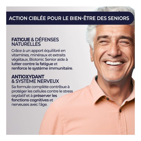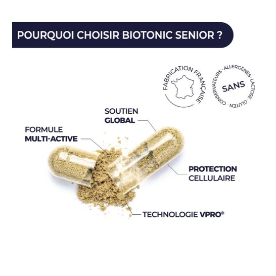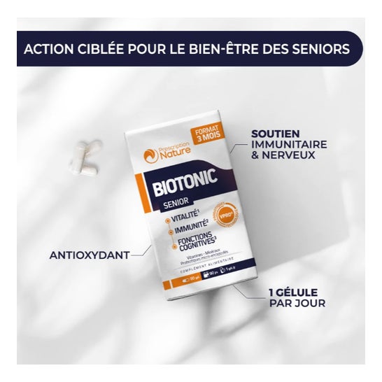 Prescription Nature Biotonic Sénior 90 Gélules est un complément complet qui combine vitamines, minéraux, extraits de plantes et probiotiques pour soutenir la vitalité au quotidien.