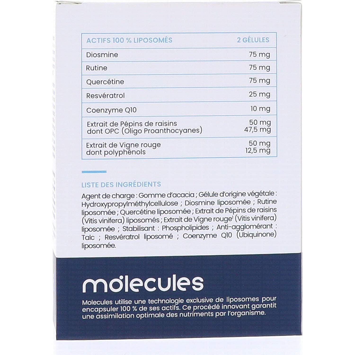 Prescription Nature Molecules Circulation 30 Perles est un complément alimentaire conçu pour contribuer à l'intégrité du système veineux, grâce à l'inclusion de Vigne Rouge. Ce produit contient également Coenzyme Q10, qui aide à protéger les cellules du stress oxydatif, et Rutine, qui favorise le bon fonctionnement des vaisseaux sanguins.